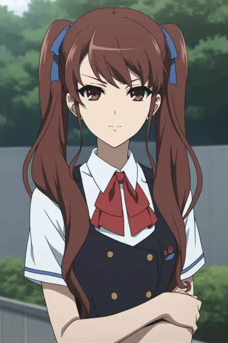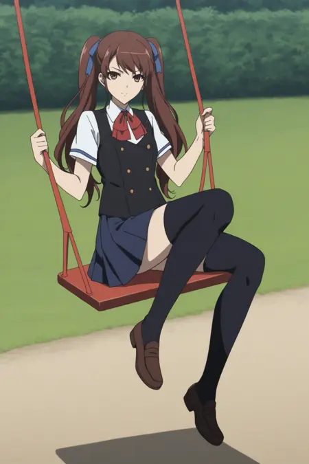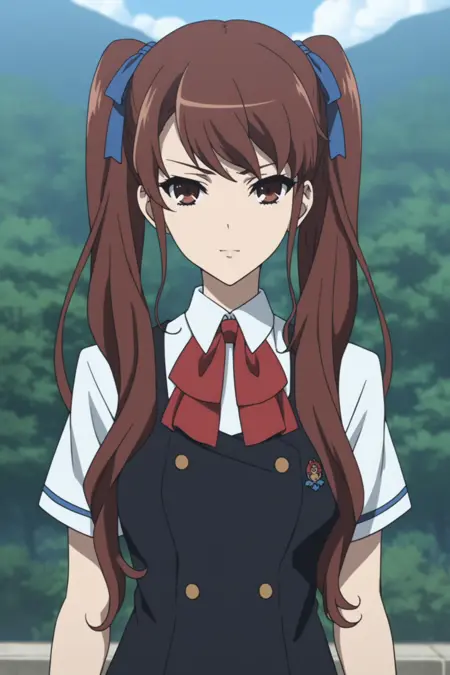akazawa izumi, 棕色头发, 长发, 双马尾, 蓝色发带, 棕色眼睛, akazawaschoolsum, 校服, 短袖, 黑色背心, 白色衬衫, 有领衬衫, 红色领巾, 学校徽章, 蓝色裙子, 百褶裙, 黑色过膝袜, 乐福鞋