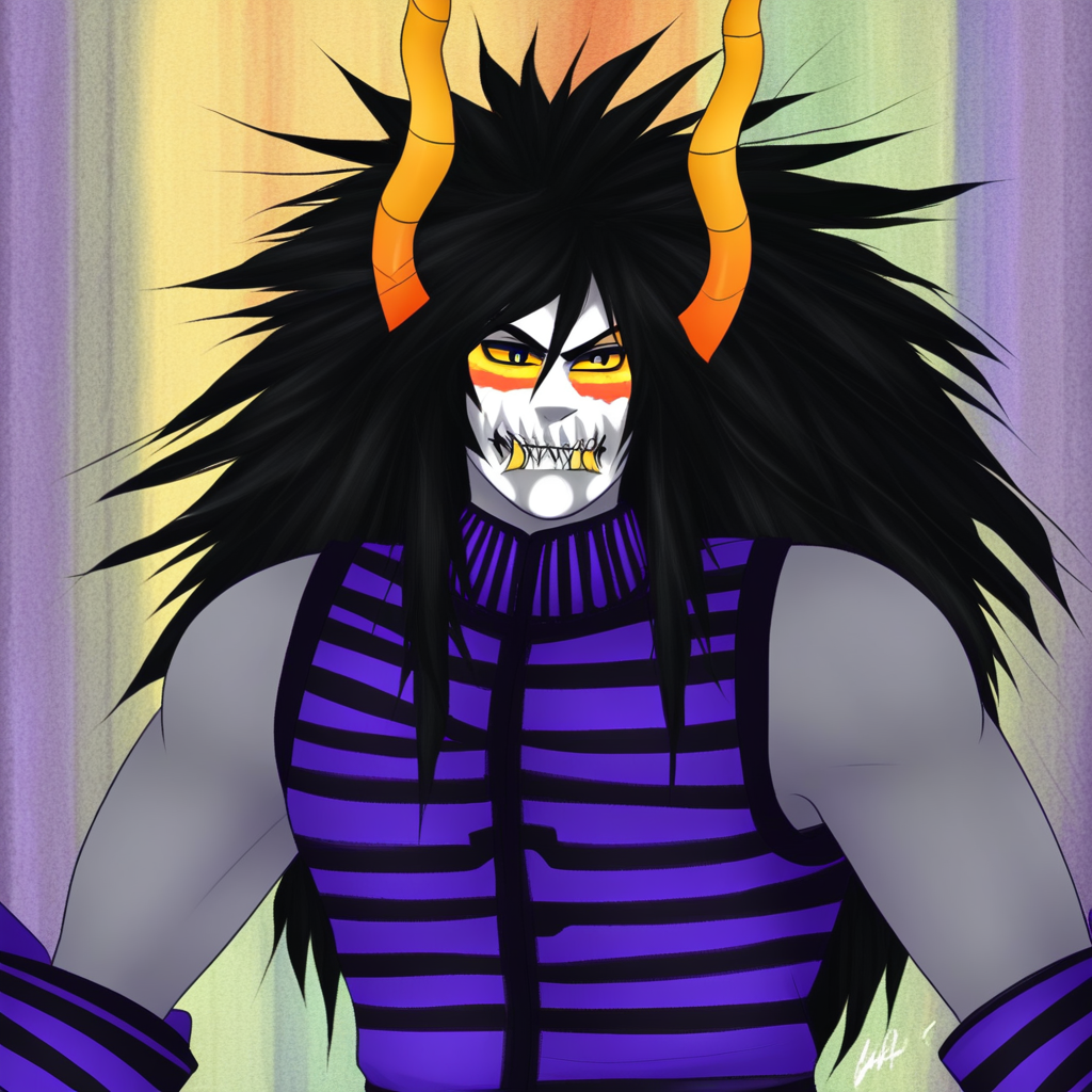 1boy, grey skin, long hair, messy hair, black hair, face paint, yellow sclera, horns,