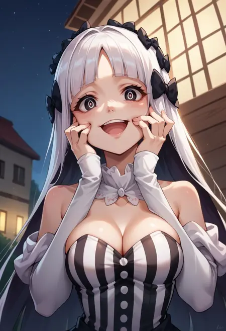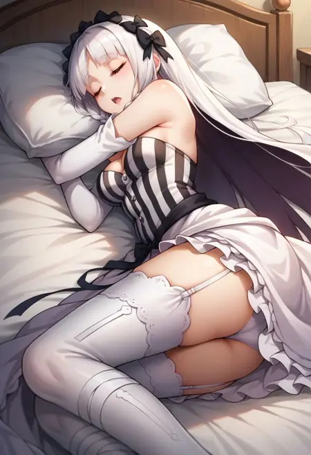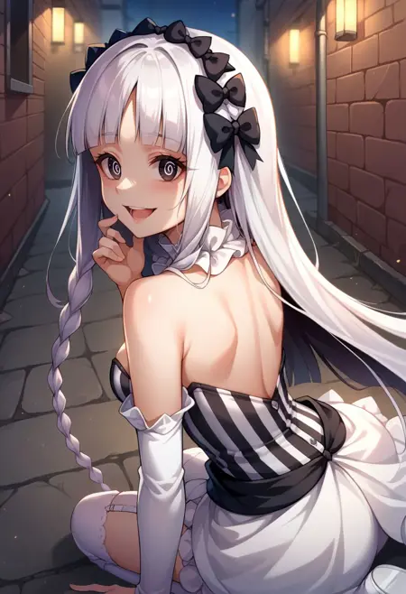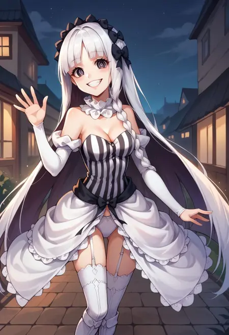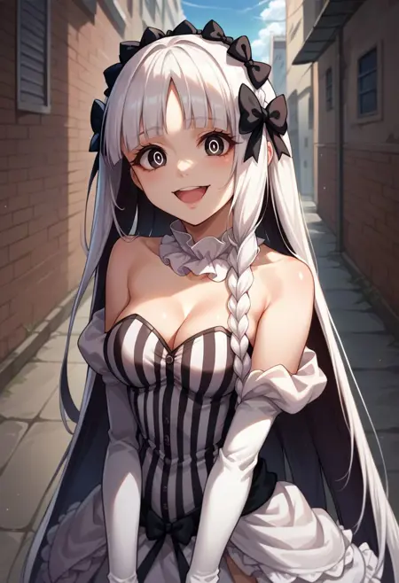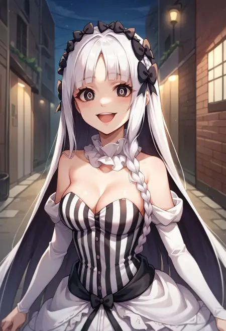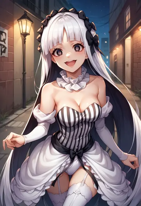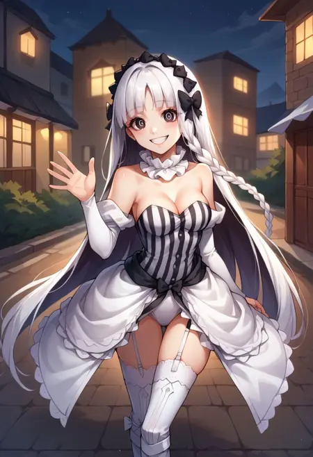 옷차림: 분리형 칼라, 드러난 어깨, 분리형 소매, 흰 드레스, 줄무늬 드레스, 수직 줄무늬 드레스, 스트랩리스, 가슴 노출, 프릴, 쇼걸 스커트, 검은 리본, 흰 팬티, 속옷, 기ャ터 스트랩, 흰 허벅지 양말, 부츠, 흰 신발