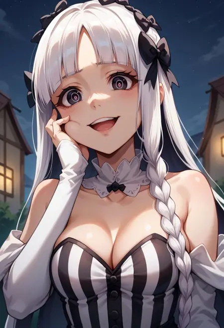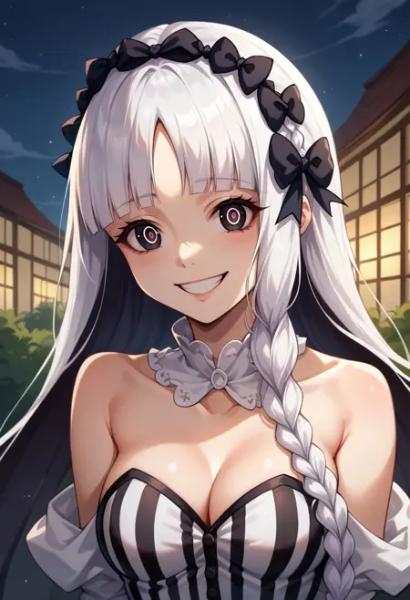외모: francescadef, 검은 눈, 기호 모양의 동공, 흰 머리, 긴 머리, 둔한 앞머리, 땋은 머리, 머리리본, 검은 리본, 머리띠, 중간 크기의 가슴