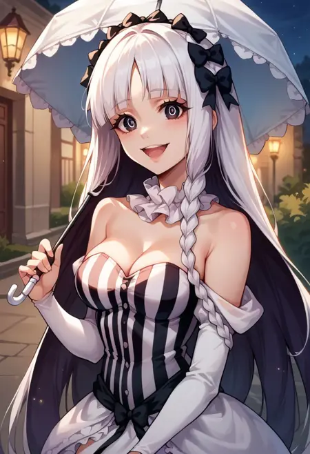 衣装:外側のカラー、肩出し、外側の袖、白いドレス、縞模様のドレス、縦縞のドレス、ストラップレス、胸元の開き、フリル、ショーガールスカート、黒いリボン、白いパンツ、下着、ガーターストラップ、白い太もも長ズボン、ブーツ、白い靴