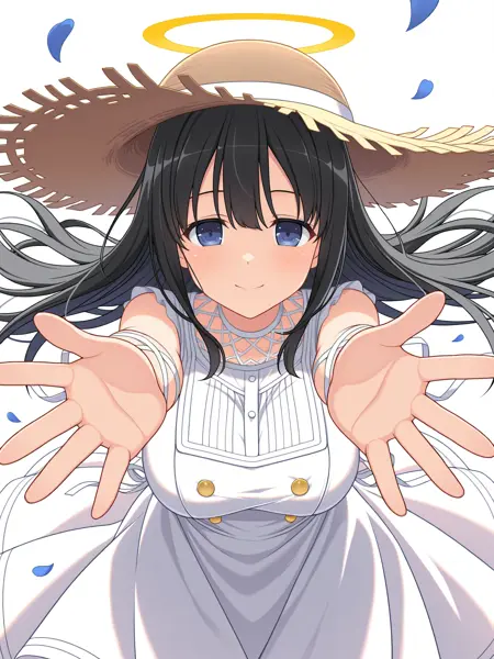 Trigger Word for the LoRA are "Ryouki_XL, blue eyes, long black hair, golden halo, hair ornament, large breasts,".