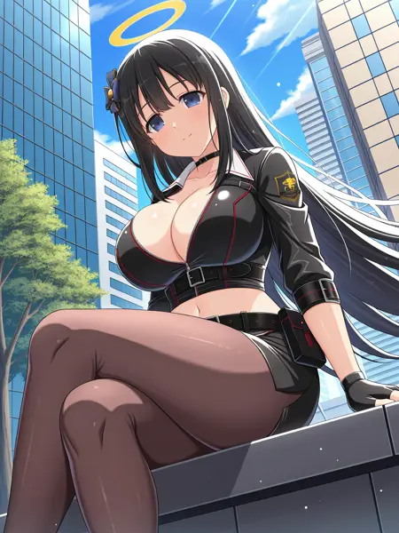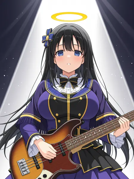 Trigger Word for the LoRA are "Ryouki_IL, blue eyes, long black hair, golden halo, hair ornament, large breasts,".