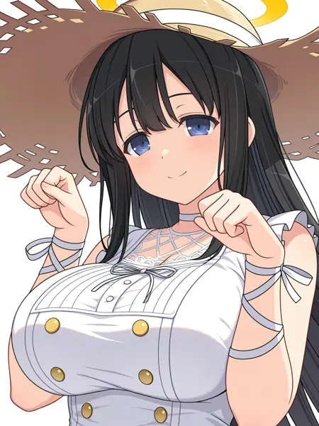 Trigger Words for her Estival outfit are "Ryouki_Estival, straw hat, white sundress, sleeveless, lace cleavage, golden buttons, wrist ribbon, shin ribbon, white shoes,". In this case, you should remove the "hair ornament" in the main prompt.