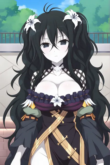 기본 복장 외형: fubukidefault, 검은 머리, 매우 긴 머리, 양쪽 올린 머리, 머리 꽃, 백합 \(꽃\), 검은 눈
