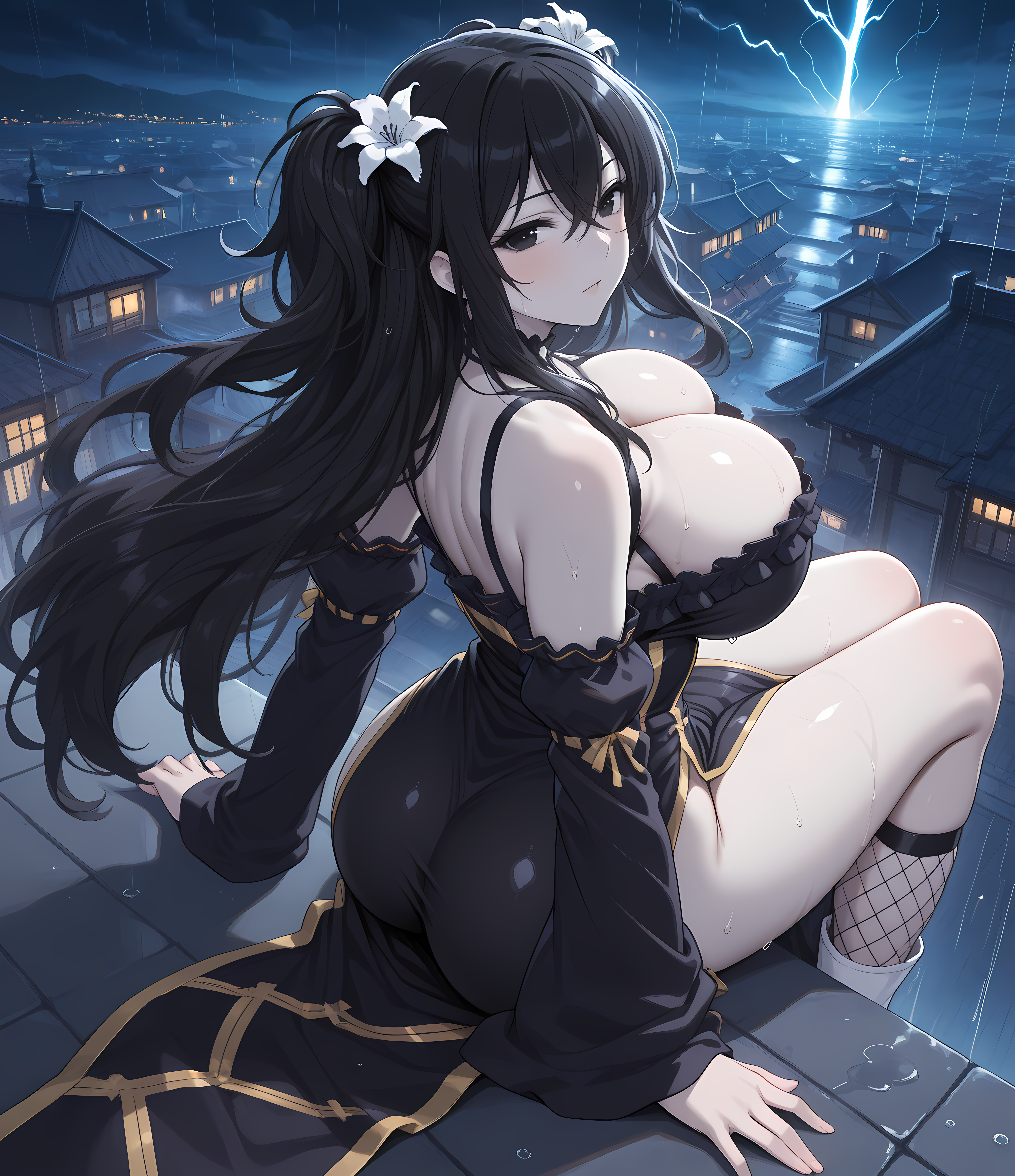 쿠노이치 복장 외형: fubukikunoichi, 검은 머리, 매우 긴 머리, 양쪽 올린 머리, 머리 꽃, 백합 \(꽃\), 검은 눈