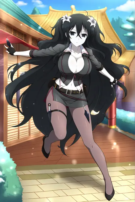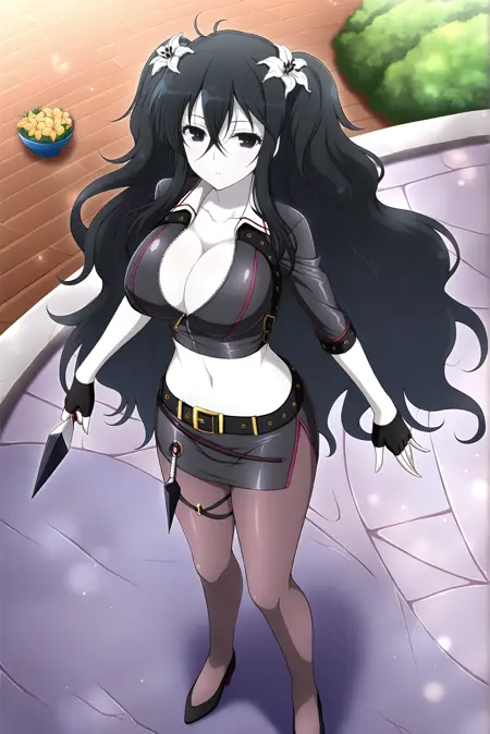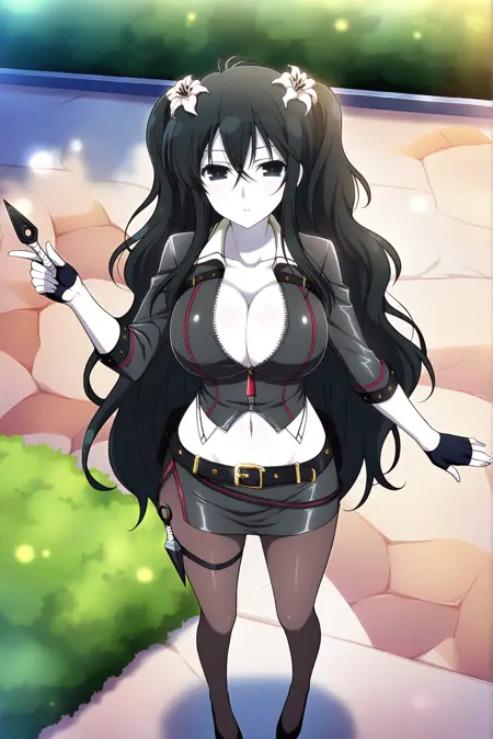 쿠노이치 복장: 검은 재킷, 가슴 노출, 복부 노출, 미니스커트, 연필 스커트, 검은 스커트, 갈색 팬티스타킹, 검은 신발, 부분적으로 벌어진 지퍼, 손가락 없는 장갑, 쿠나이, 허벅지 스트랩