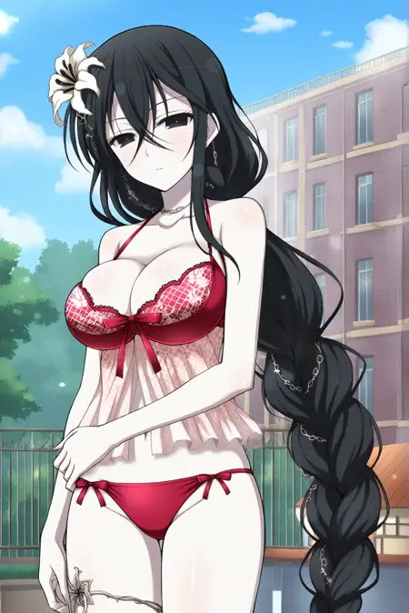 수영복 복장 외형: fubukib3ach, 검은 머리, 긴 머리, 땋은 머리카락, 검은 눈