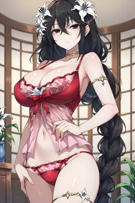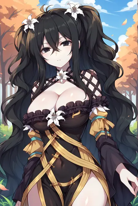Kunoichi Outfit Appearance: fubukikunoichi, black hair, very long hair, two side up, hair flower, lily \(flower\), black eyes