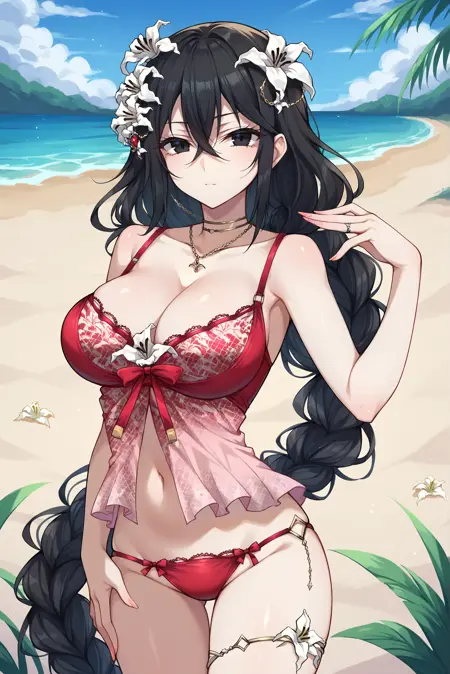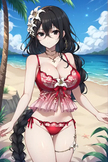 Swimsuit Outfit Appearance: fubukib3ach, black hair, long hair, braided ponytail, black eyes