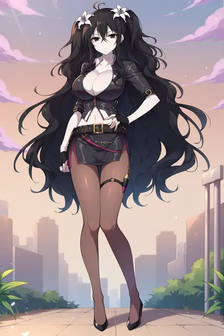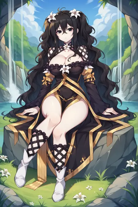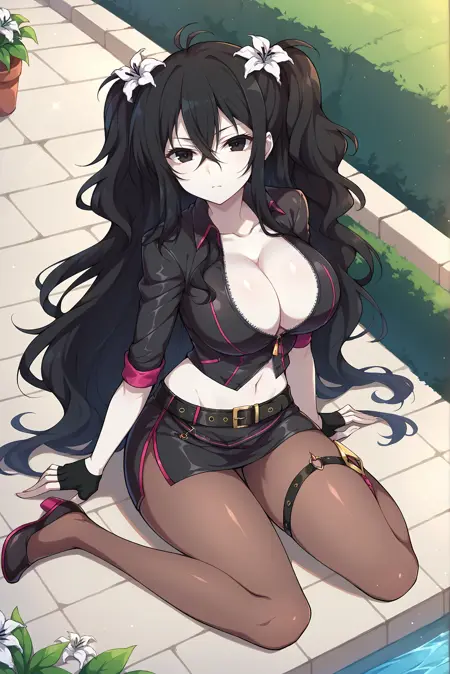 Default Outfit Appearance: fubukidefault, black hair, very long hair, two side up, hair flower, lily \(flower\), black eyes