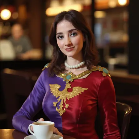 jdwgcv6 with a tall crown and a white pearl necklace, she is wearing a red and purple split color dress with a heraldic eagle logo, holding a sceptre, standing in front of a black background, video game screenshot