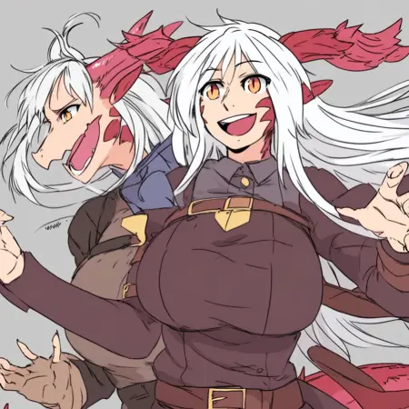 1个女孩,单独,白发,张开嘴,微笑,大乳房,角,龙角,龙女,龙尾,黄眼睛,尖牙