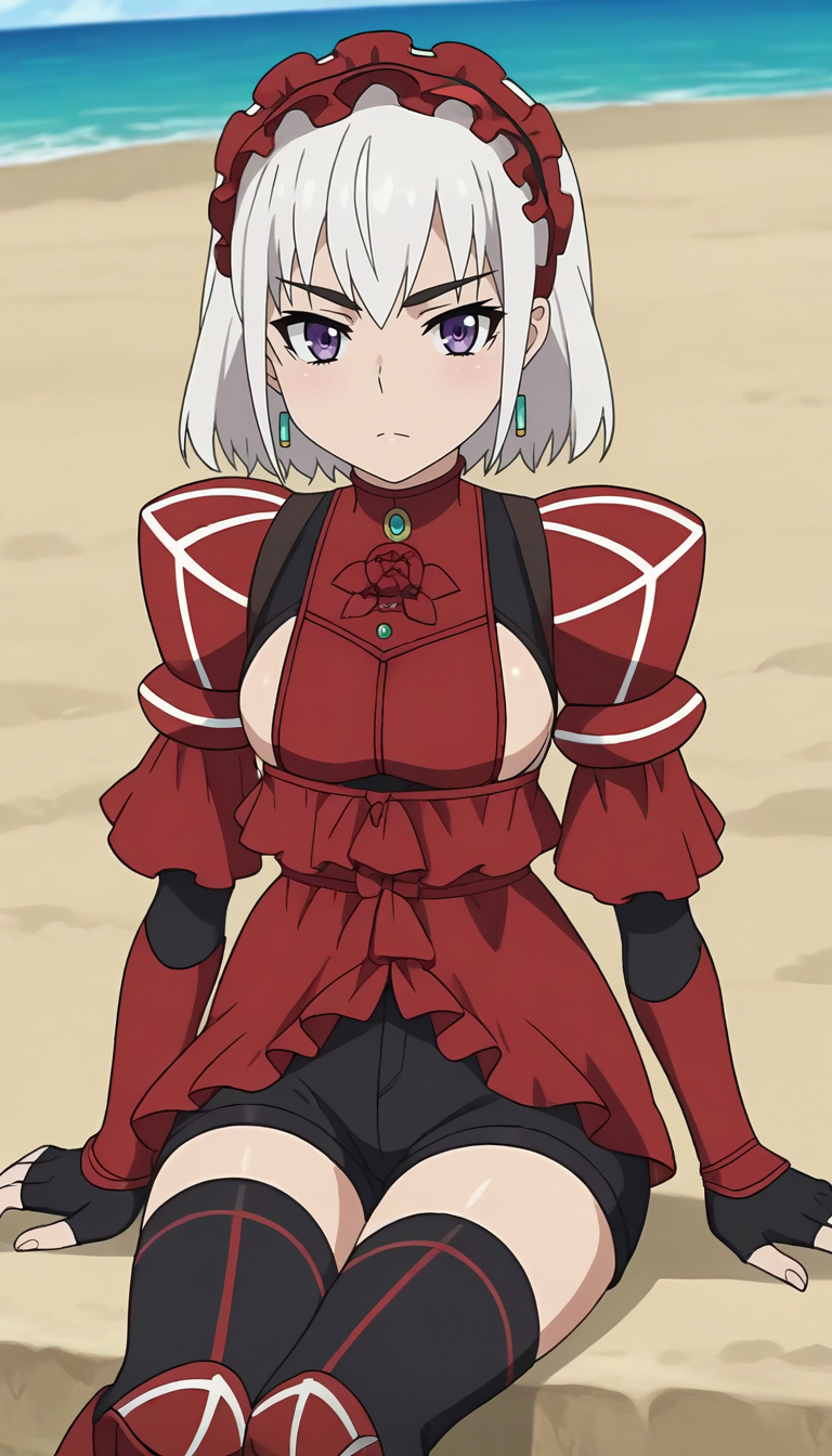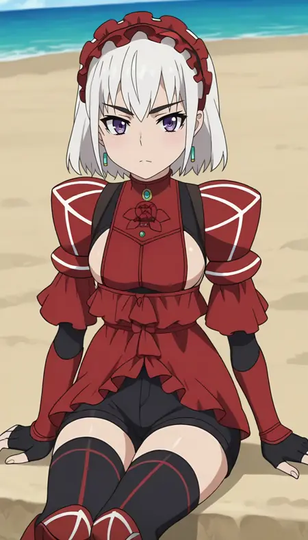 • 服装: 天蓝色耳环,红色花边发带,黑色发带,红色膝靴,黑色手套,腰带,黑色过膝袜,露指手套,长袖,胸甲,红色装甲,臂甲,上衣,黑色短裤,短裤,高腰露侧乳,花边,红色女仆头饰