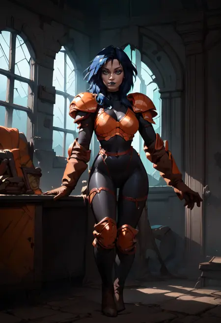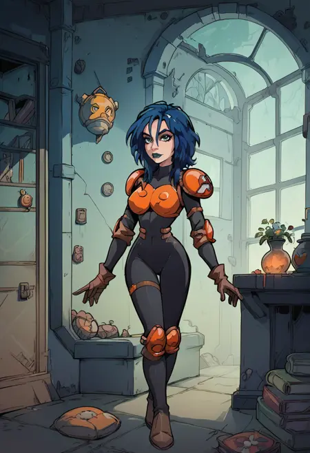 After more than a hundred tries and many experiments, I've managed to create a pretty fine version; however, this is still not satisfying for me, especially because of those damn straps of armor (I really hate struggling with them, they are still not so stable to use, but much better than earlier). Use a strength 0.9-0.7. There are two blocks of trigger words, and although using 'navy' a few times in them isn't a good decision, it's a smaller sacrifice. The bad part of it is that if you want the original outfit, you could end up with blue armor or just a bodysuit; therefore, put 'orange armor' in your prompt as early as possible or/and increase its strength.