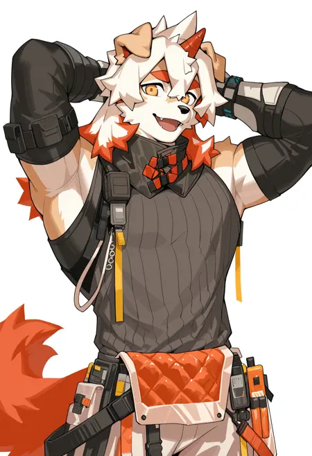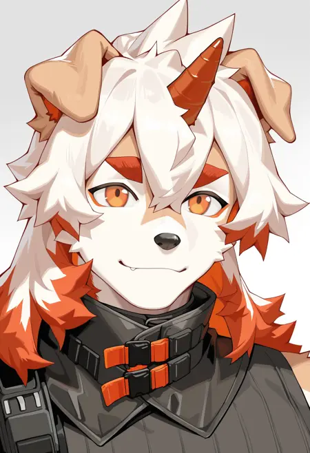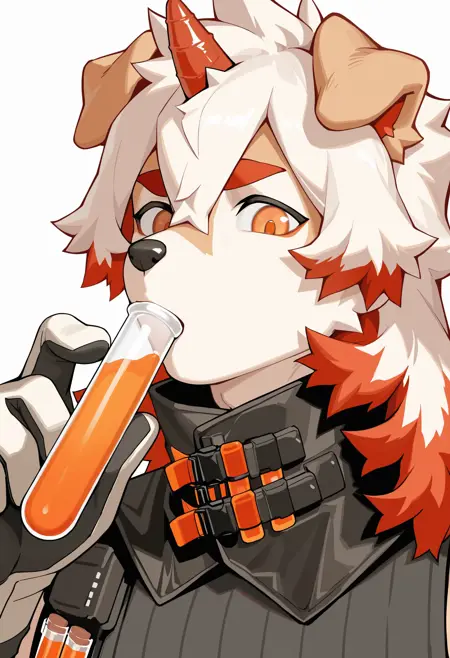 Pony: score_9, score_8_up, score_7_up, high quality, hires, furry, anthro, solo, hung, perro, arknights, two-tone fur, medium hair, white hair, single horn, orange eyes, ...your tags...