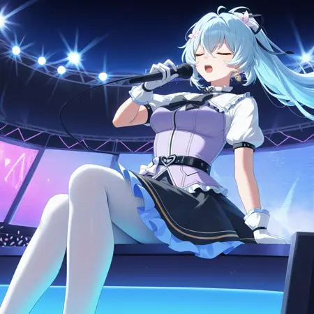 ShiKirHi3,Fol002,Shk_Ggz,浅蓝色头发,蓝色眼睛,浅紫色背心,荷叶边背心,白色领子,荷叶边领子,蓬松短袖,白色袖子,白色衬衫,荷叶边手套,白色手套,荷叶边裙子,黑色裙子,荷叶边,腰带,心形(符号),发带,黑色发带,白色连裤袜,单只耳环,花朵发饰,马尾,