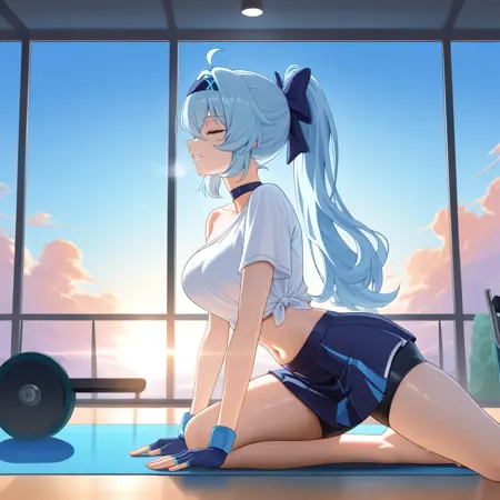 ShiKirHi3,Fol002,Shk_Trn,浅蓝色头发,蓝色眼睛,系带衬衫,白色衬衫,单肩衬衫,裙下骑行短裤,蓝色手套,露指手套,内衣肩带,深蓝色项圈,超短裙,深蓝色发带,深蓝色蝴蝶结,发带,马尾,露腹,肚脐,深蓝色裙子,网球裙,