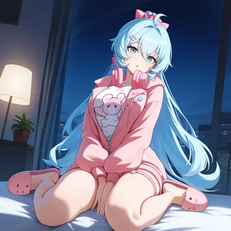 ShiKirHi3,Fol001,Shk_Paj,浅蓝色头发,蓝色眼睛,马尾,发圈,粉色发圈,长衬衫,白色衬衫,未拉链,印花衬衫,拉链,粉色耳机,耳机挂在脖子上,粉色发夹,粉色大腿带,敞开式夹克,粉色夹克,蓬松长袖,别针,发饰,粉色蝴蝶结,粉色拖鞋,