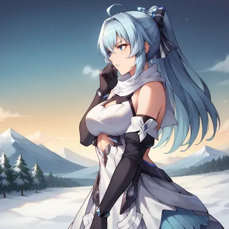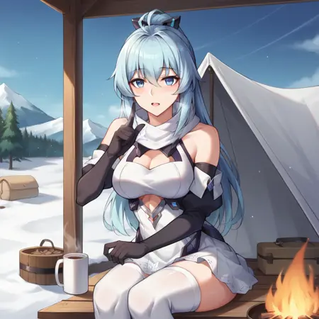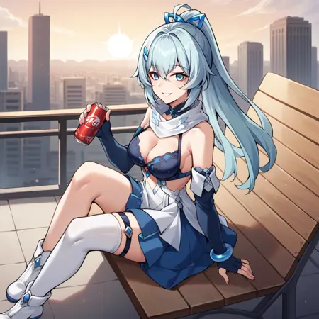 ShiKirHi3, Fol001, Shk_Def, light blue hair, blue eyes, braid, ponytail, white halterneck, halter dress, dark blue turtleneck, white scarf, scarf, brooch, cross-laced bra, dark blue bra, cleavage, gradient dress, blue dress, cross-laced skirt, blue gemstone, white trim, side cutout, clothing cutout, two-tone skirt, white skirt, blue skirt, dark blue thigh pouch, single thigh boot, white legwear, white footwear, asymmetrical legwear, long sleeves, detached sleeves, dark blue sleeves, single wrist cuff, white wrist cuffs, single fingerless glove, dark blue gloves, bare shoulders, blue hairclip, blue ribbon, hair ribbon,