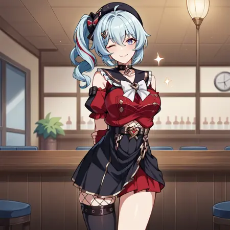 Kira_Red, side ponytail, streaked hair, red hair, black beret, hair ornament, red shirt, fishnets, red skirt, black skirt, detached sleeves, black sailor collar, white bowtie, thigh strap, puffy short sleeves, pleated skirt, red sleeves, fingerless gloves, elbow gloves, red gloves, black gloves, mismatched gloves, black thighhighs, single thighhigh,
