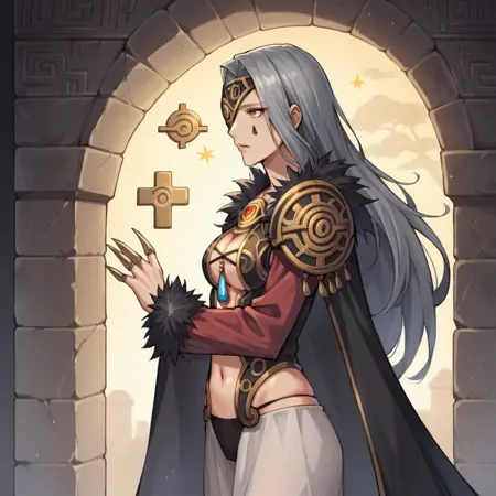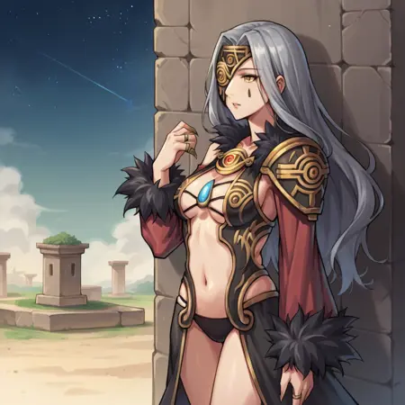 검은 드레스, 중앙 개방형, 배꼽, 털 장식, 노출된 드레스, 긴 소매, 털 장식 소매, 어깨 갑옷, 빨간 소매, 가슴 스트랩, 가슴 보석, 측면 절개, 발톱 링, 긴 치마, 흰 치마, 검은 치마, 허벅지 절개, 검은 속옷,