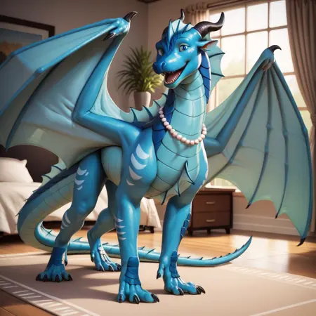 追加プロンプト:blue scales, pearls, pearl necklace, green eyes, female, 1girl, Seawing, Seawing scale pattern, dragon, scales, wings, horns, tail, fins, claws, chest fins