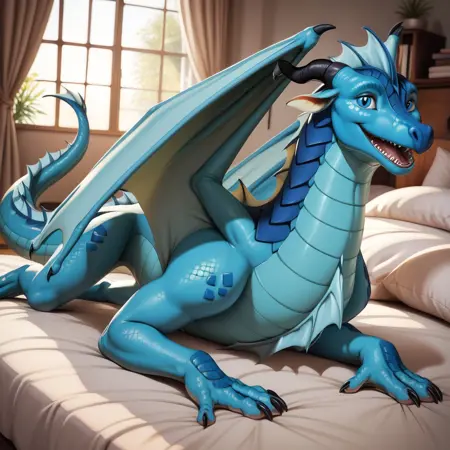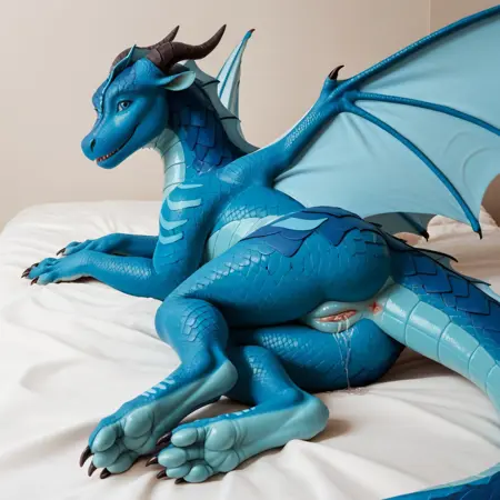 追加プロンプト:Seawing_wof, dragon, scales, horns, claws, wings, tail, aquatic scales, blue eyes, 1girl, female, chin tendrils, head frill, chest frill, webbed claws, webbed feet