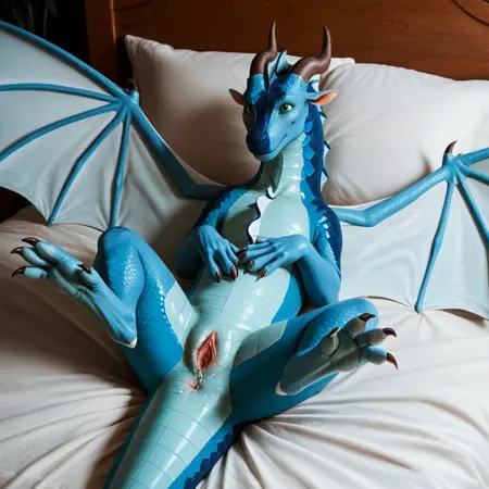 Additional prompts: Seawing_wof, dragon, scales, horns, claws, wings, tail, aquatic scales, blue eyes, 1girl, female, chin tendrils, head frill, chest frill, webbed claws, webbed feet