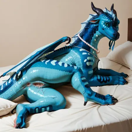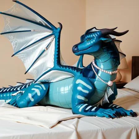 Additional prompts: blue scales, pearls, pearl necklace, green eyes, female, 1girl, Seawing, Seawing scale pattern, dragon, scales, wings, horns, tail, fins, claws, chest fins