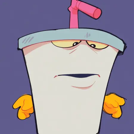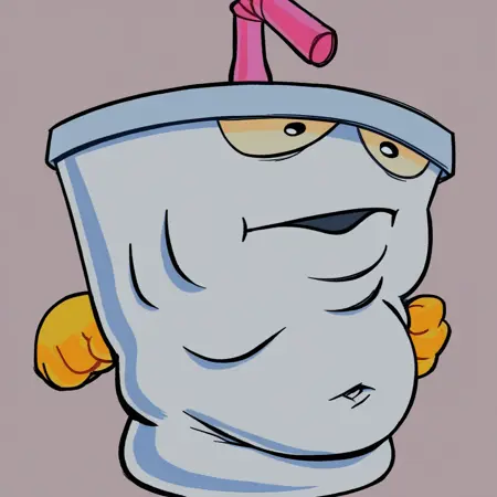 강화 태그: 마스터 샤크, 컵, 남성, 비인간형 남성, 분홍색 빨대, 빨대가 머리 위에, 빨대, 큰 눈, 갈색 공막, 흰색 몸, 다리 없음, 팔 없음, 손, 노란 손, 노란 장갑, 떠 있는 손, 4개의 손가락, 큰 입