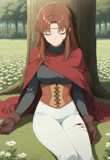 Notable tags: long hair, brown hair, circlet, sweater, red cape, corset, gloves, White leggings