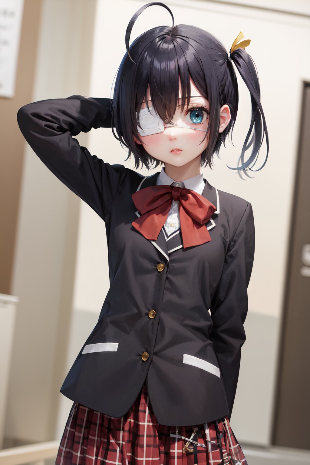 Default Outfit: medical eyepatch, school uniform, jacket, plaid skirt