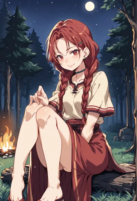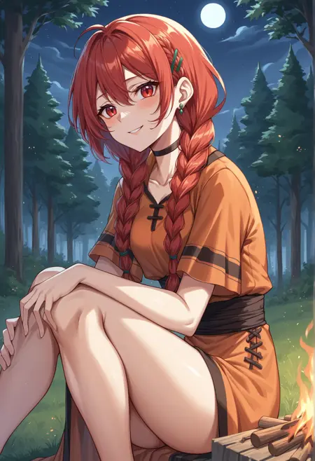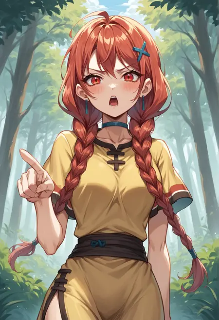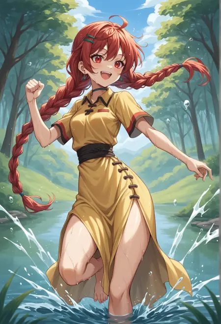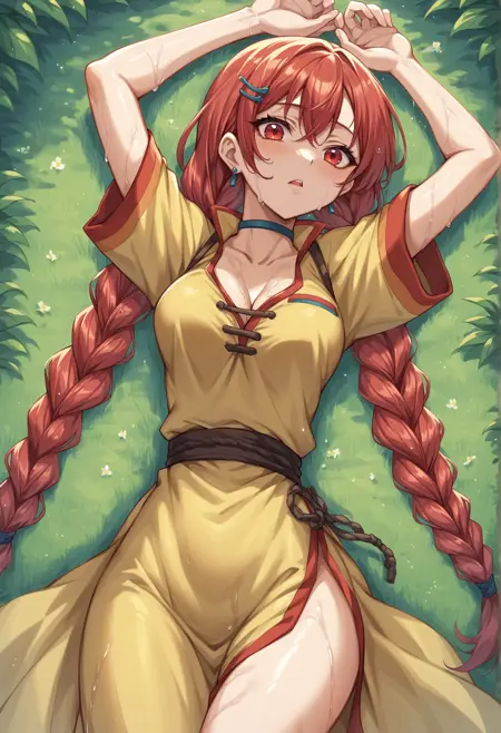 Notable tags: red hair, long hair, red eyes, low twin braids, hair ornament, long dress, yellow dress, short sleeves, side slit, choker, earrings,