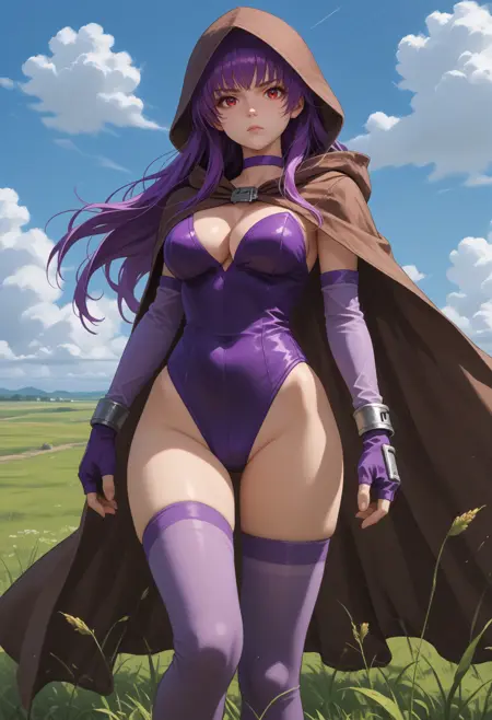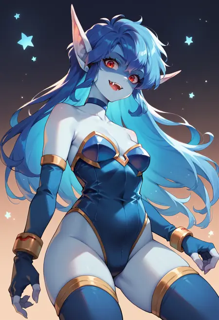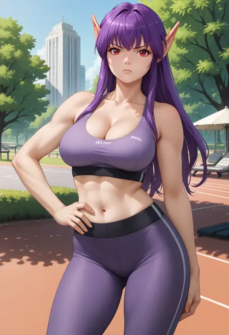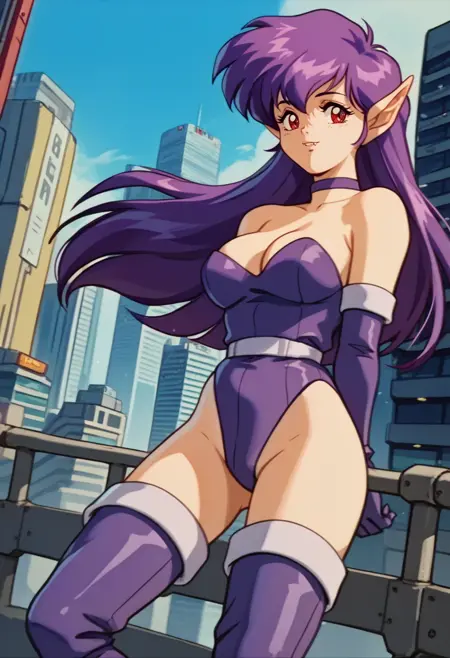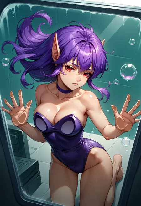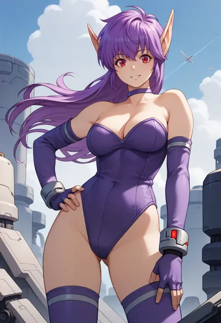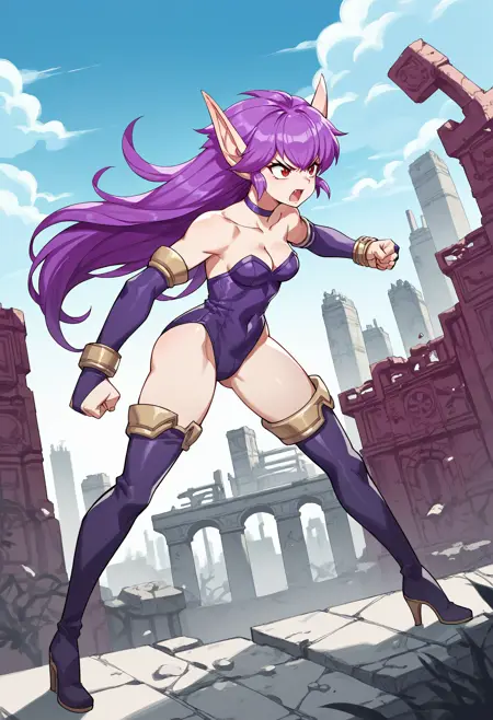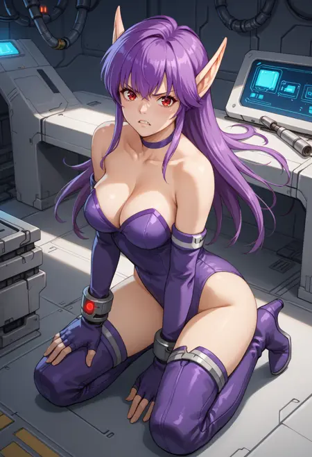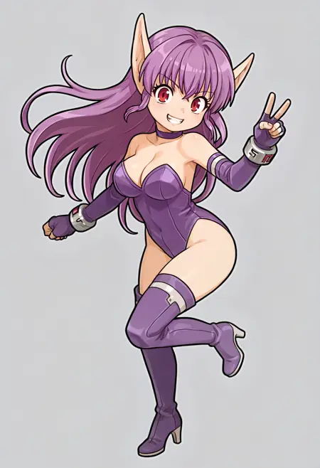 기본 외모: neiPS, 긴 머리, 보라색 머리, 붉은 눈, 뾰족한 귀, 보라색 목걸이, 보라색 레오타드, 가슴 노출, 어깨 노출, 팔꿈치 장갑, 보라색 장갑, 손가락 없는 장갑, 팔찌, 보라색 허벅지 긴 양말