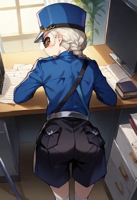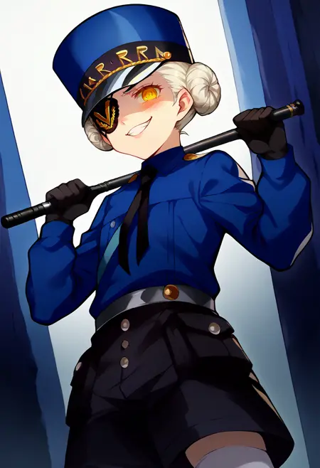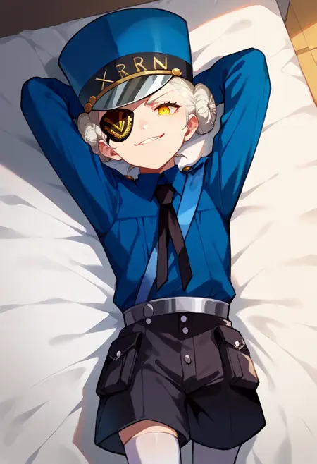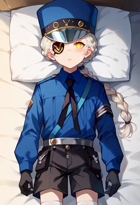 지스틴: p5just, 흰 머리카락, 단일 땋은 머리, 안대, 검은 장갑, 유니폼, 파란 모자, 파란 칼라 셔츠, 검은 넥타이, 긴 소매, 검은 반바지, 단일 흰 허벅지 양말,