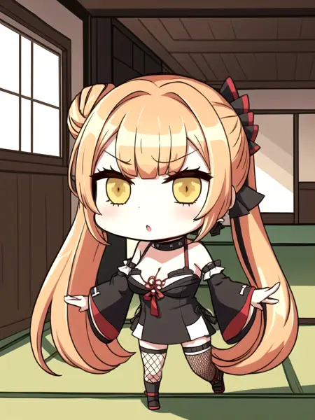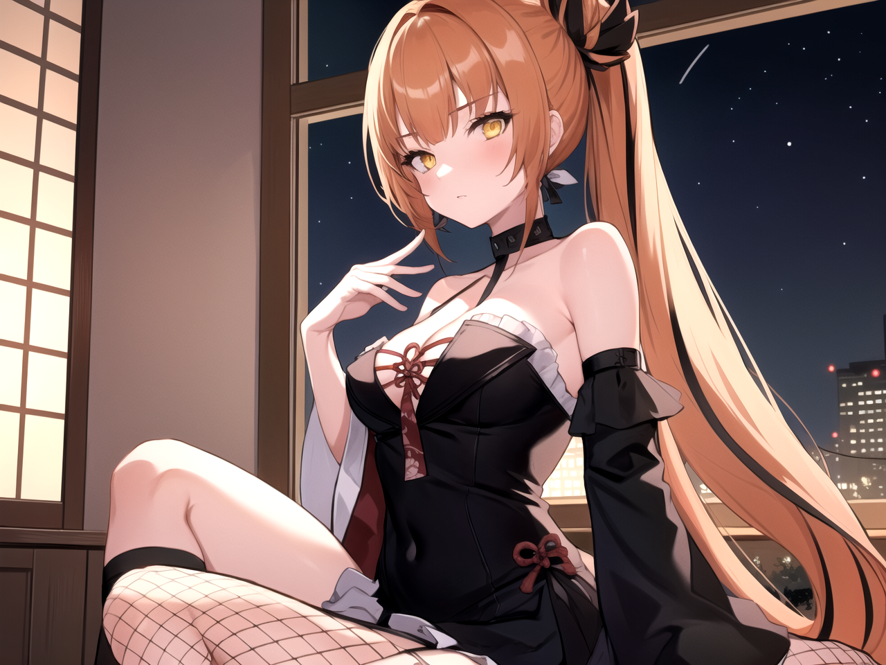 dsmellona,橙发,超长发,侧马尾,发髻,发饰,黄眼,黑色连衣裙,无袖设计,事业线,露肩,网纱长筒袜,不对称腿装