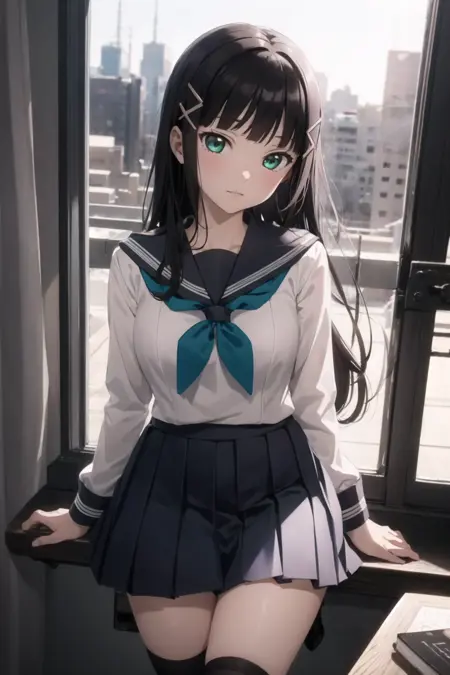 使用するべきタグ: ソロ、黒澤手帳、緑の目、髪飾り、長い髪、中程度の胸