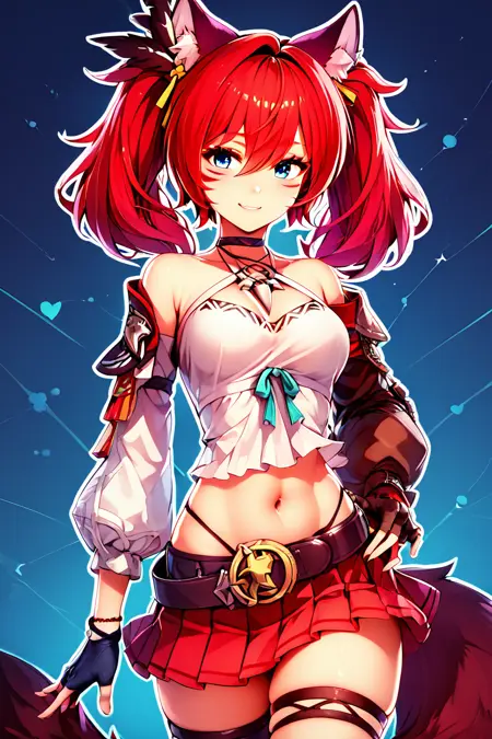 zzTerara、赤髪、狐の尾、眉間の髪、片側だけの手袋、裸の肩、ベルト、黒首輪、黒手袋、クロスハーネス、カーディガントップ、取り外し可能な袖、指なし手袋、狐の尾、ハーネスネック、ジュエリー、長袖、ミニスカート、へそ、ネックレス、プリーツスカート、赤スカート、太ももストラップ、白シャツ、