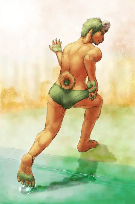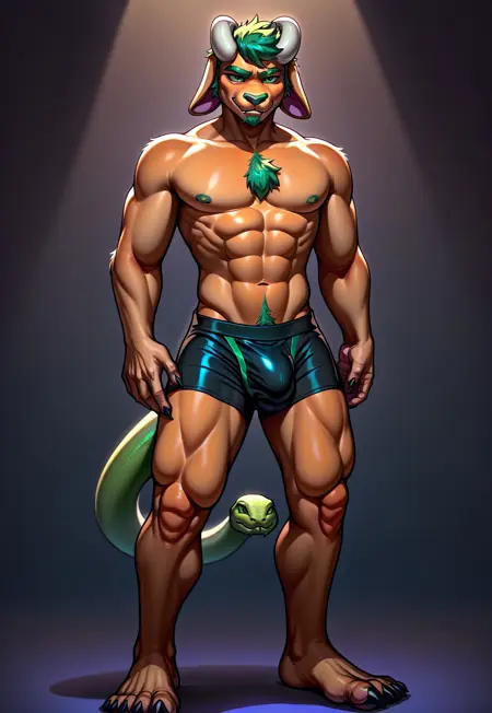 Illustrious Tags (V4): shimerachimera, solo, full body, 1boy, furry, colored skin, orange skin, green hair, green eyes, horns, animal nose, goat ears, facial hair, goat tail, snake head tail, sharp nails, pawpads, muscular, plantigrade