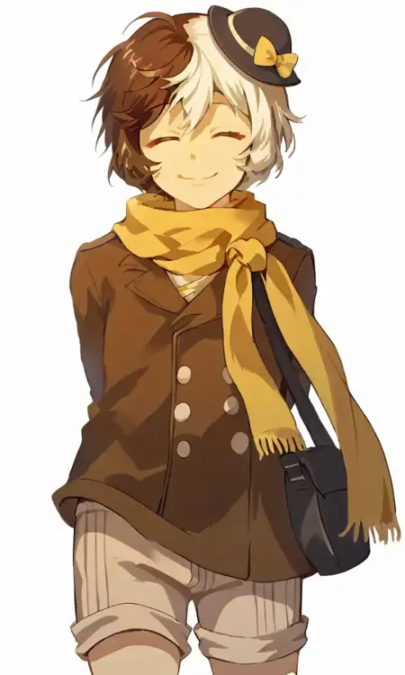 1other, solo, white hair, brown hair, multicolored hair, two-tone hair, split-color hair, short hair, hat, bow, yellow scarf, jacket, bandages, shorts, socks, shoes, black eyes, yellow pupils, symbol-shaped pupils