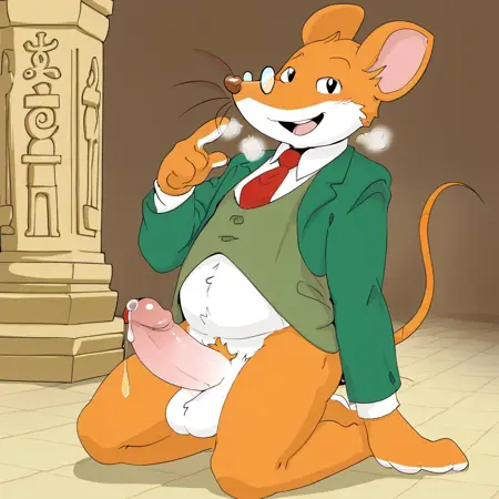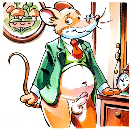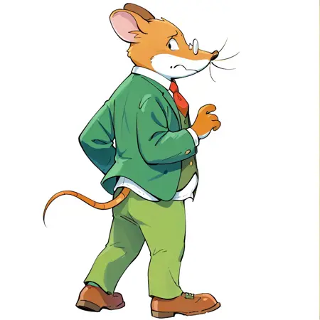 良質な生成を促すボーナスワード:緑のジャケット、緑のベスト、オレンジの毛並み、白い口吻、ひげ、メガネ、ネズミのしっぽ