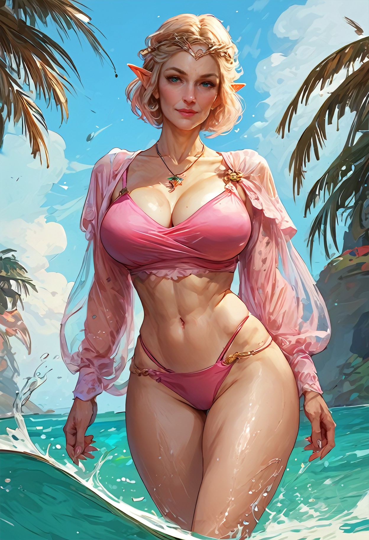 Should produce a lady somewhat resembling Galadriel from Lord of the rings, but with short hair, white shirt, black leggings and some extra curves.