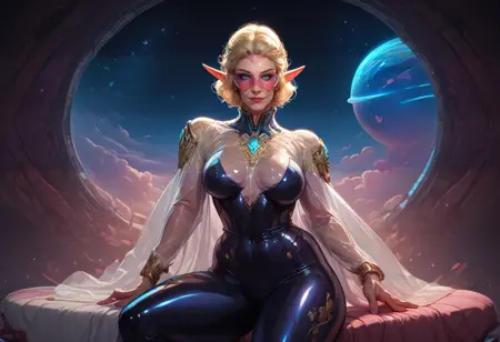 Should produce a lady somewhat resembling Galadriel from Lord of the rings, but with short hair, white shirt, black leggings and some extra curves.