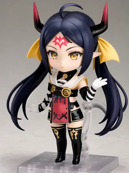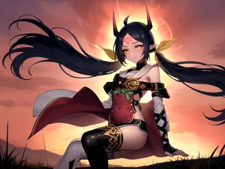 dsaravi, 黑发, 黄色眼睛, 尖耳朵, 非常长的头发, 双马尾, 天灵盖毛, 角, 额头标记, 发带, 红色背心, 胸带, 手肘手套, 高筒靴, 黑色短裤