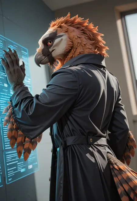 // 华丽: mur1at_oc, avian, bird boy, bearded vulture, anthro, male, furry, beak, male focus, looking at viewer, feathers, solo, tail, 1boy, colored sclera, black body fur, fur, claws