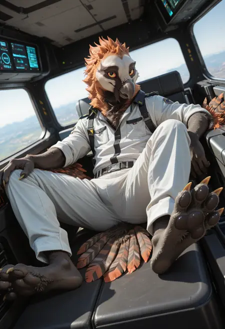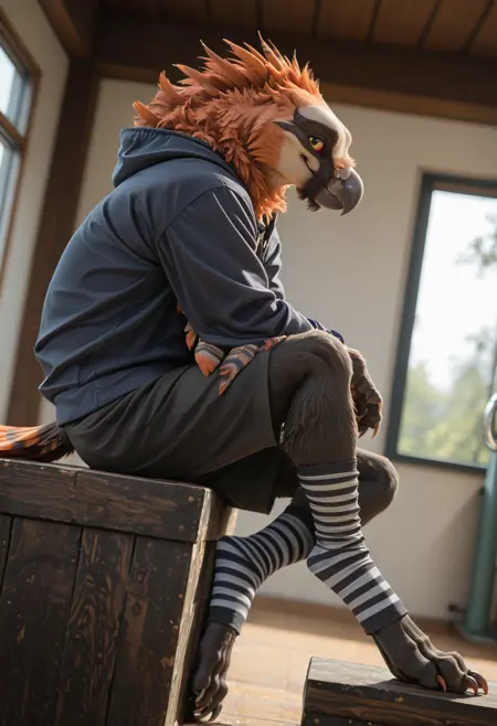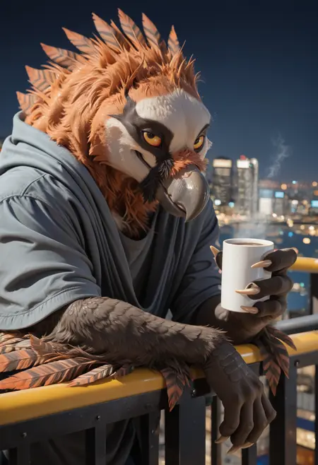 📝 Muriat 是一个具有狼人特征的拟人化秃鹫——源自毛茸茸社区的原创角色。他肌肉发达,全身覆盖着深灰色的毛发与羽毛,拥有橙色的冠羽、条纹状的尾巴,以及喙下黑色的“胡须”。他黄色的眼睛和捕食者的姿态凸显了野生猎手的力量与高贵。