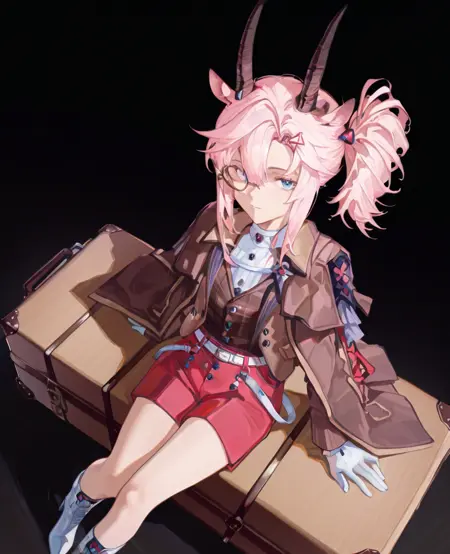 1girl, solo, earthspirit, looking at viewer, pink hair, ponytail, hair between eyes, bangs, horns, animal ears, blue eyes, goat tail,