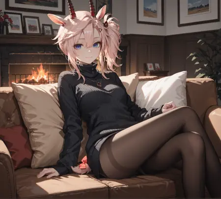 1girl, solo, earthspirit, looking at viewer, pink hair, ponytail, hair between eyes, bangs, horns, animal ears, blue eyes, goat tail,