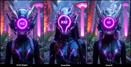 예시 프롬프트: "날카롭고 결정형 디자인을 가진 미래형 사이버펑크 헬멧의 클로즈업 초상으로, 금속적인 은색과 생동감 있는 보라색을 사용하고, 중앙에는 'XIZ'라는 글자가 빛나는 보라색 LED 링과 결정처럼 돌출된 부분이 있습니다. 인물은 광택 있는 검은 바디수트를 착용하며, 이ridescence 보라색과 시안 패턴이 있습니다."